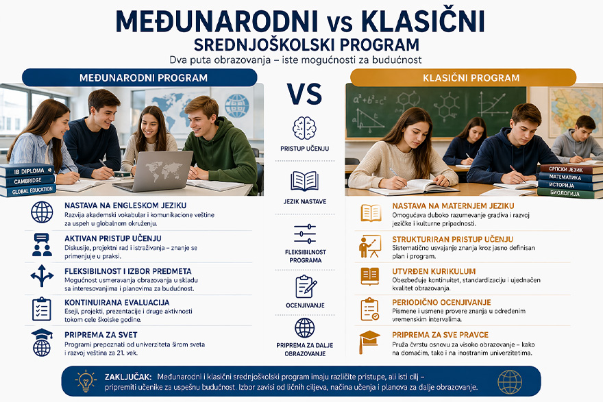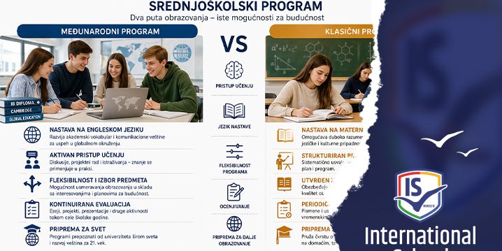 Razlika između međunarodnog i klasičnog srednjoškolskog programa ogleda se pre svega u pristupu učenju, fleksibilnosti i usmerenosti ka budućnosti. Dok međunarodni programi nude globalnu perspektivu, nastavu na engleskom jeziku i razvoj savremenih veština, klasični programi obezbeđuju stabilnost i temeljno obrazovanje u okviru nacionalnog sistema.