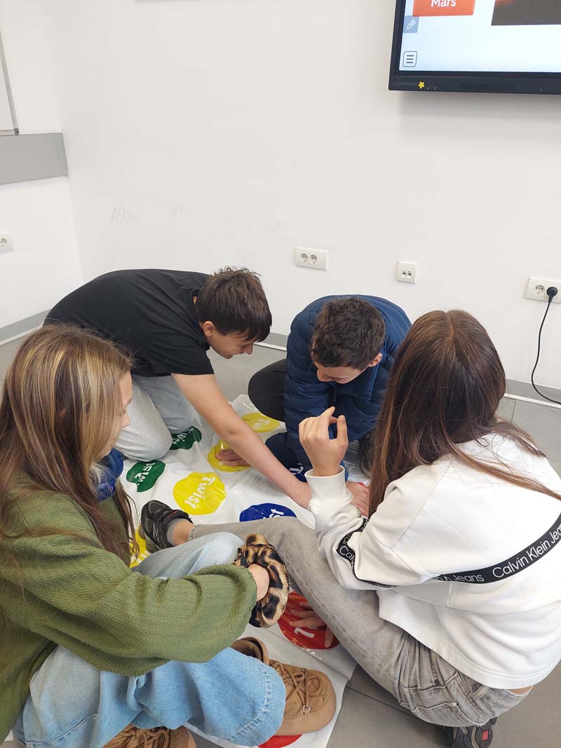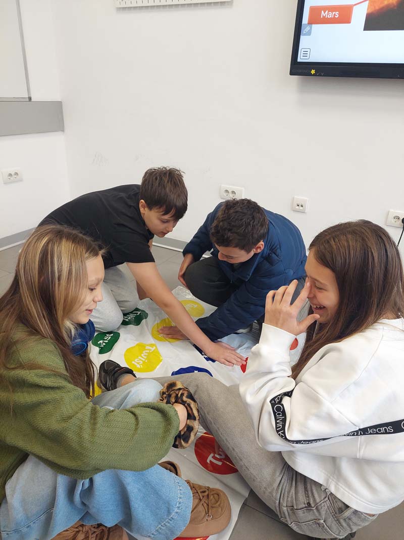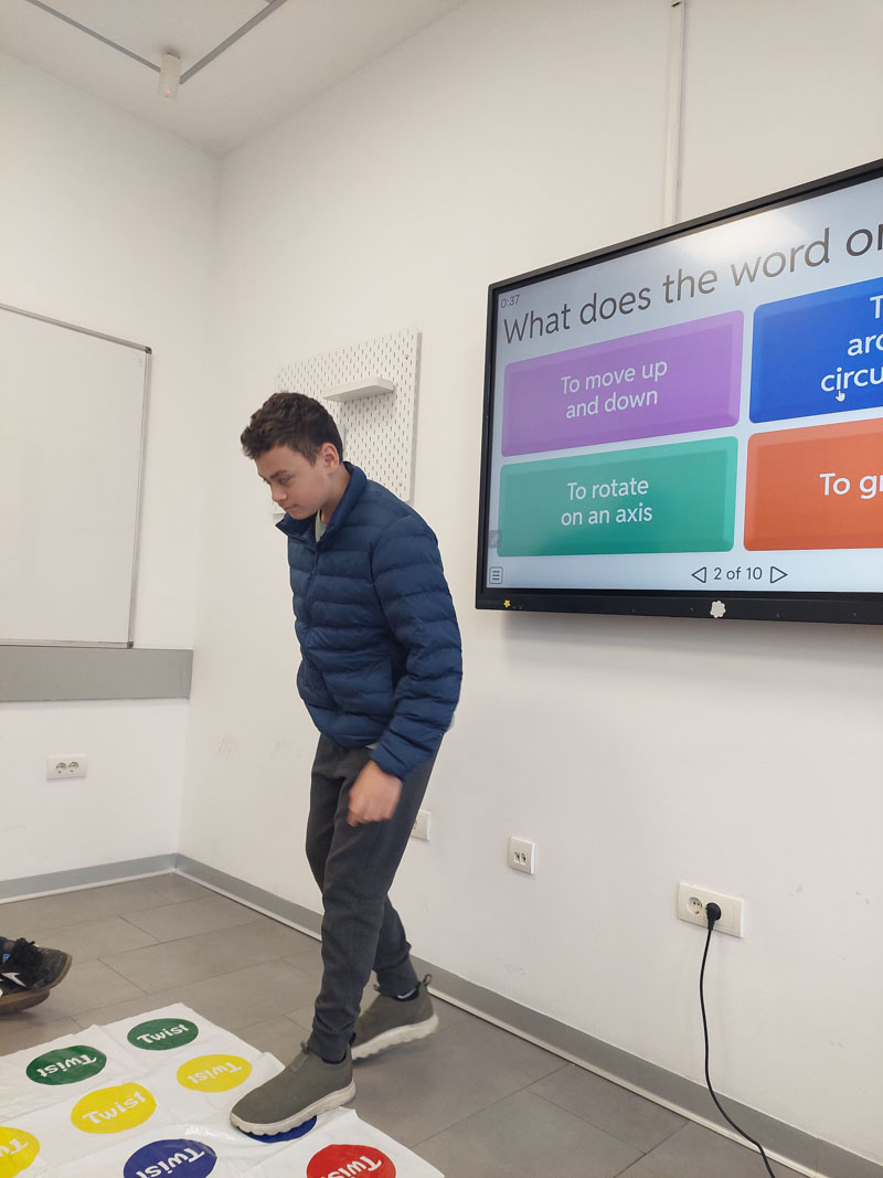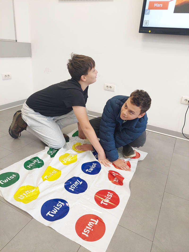 Umesto tradicionalnog časa za obnavljanje gradiva, učenici su koristili dobro poznatu igru Twister kako bi proverili svoje znanje. Uz svaki pokret koji bi napravili na Twister prostirci, morali su da odgovore na pitanje vezano za gradivo – istovremeno izazivajući svoje razumevanje naučnih pojmova i fizičku koordinaciju.